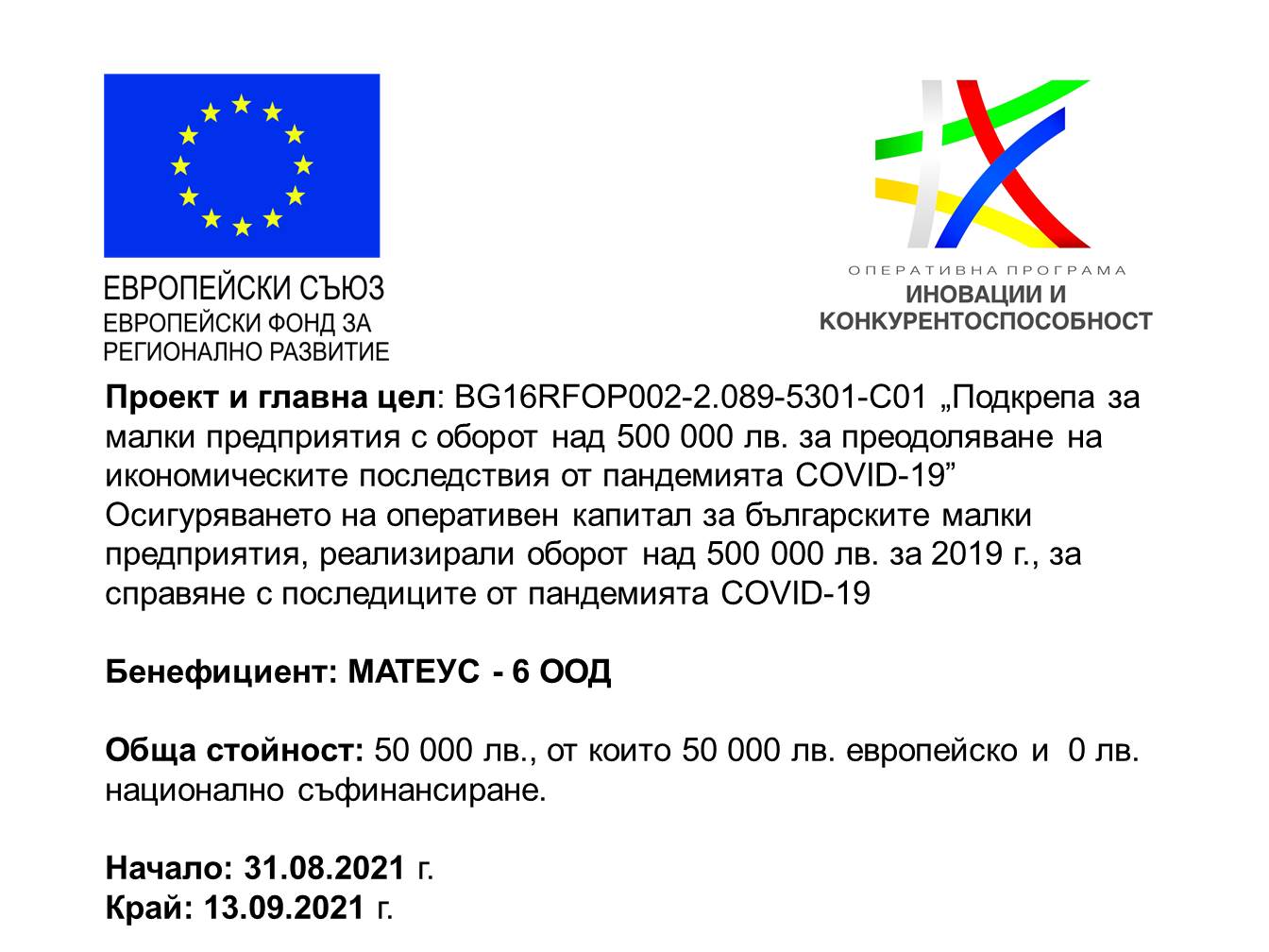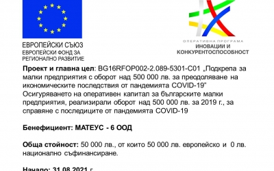 "Матеус 6" ООД - Бургас участва в проект "Подкрепа за малки и средни предприятия с оборот над 500 000 лв. за преодоляване на икономическите последствия от пандемията COVID- 19". Цел на проекта е да осигури оперативен капитал на българските малки предприятия, реализирали оборот над 500 000 лв. за 2019г. за справяне с последиците от пандемията COVID- 19. Стойността на проекта е 50 000 лв, от които 50 000лв европейско и 0лв. национално съфинансиране.